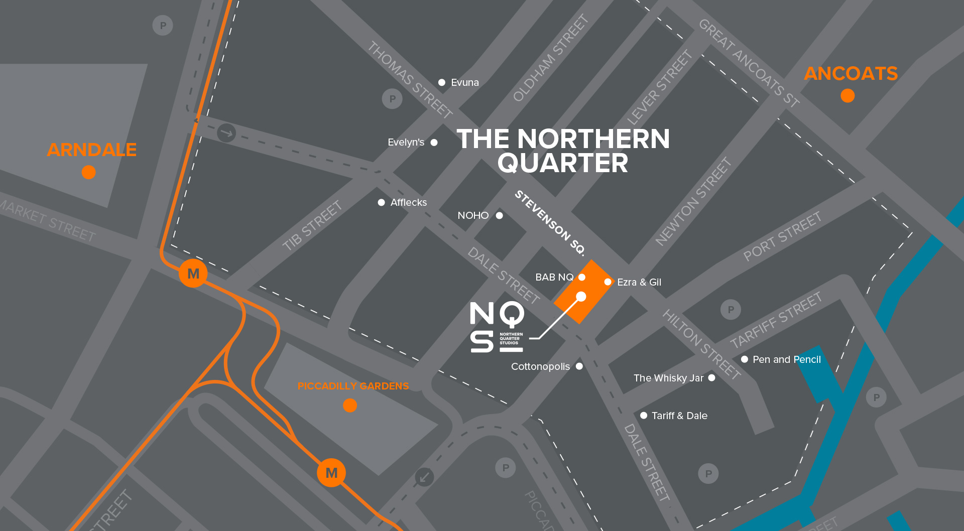 NQ Studios is located in the heart of the vibrant Northern Quarter, adjacent to the popular Stevenson Square and a stone’s throw away from major transport links including Piccadilly Railway Stations and Piccadilly Gardens. NQ Studios is home to an eclectic mix of creative agencies, corporates and start-ups, as well as Ezra & Gil coffee shop and BAB, two of Manchester’s most popular food and leisure destinations.